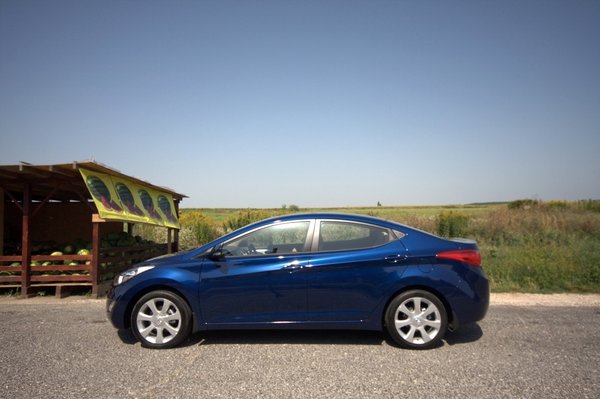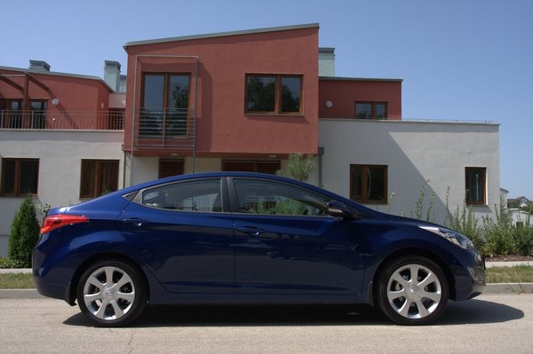 Az Elantra külseje egészen szokatlan. A Hyundai teljesen új dizájnt talált ki, amit folyékony szobrászatnak hívnak. A lényege, hogy ívekkel és hullámokkal rajzolják meg az autókat. Elsőre ugyan fura, de aki már látott i40-et, annak hamar rááll a szeme – legalábbis én így vagyok vele. Mindenesetre élőben nem rossz. Továbbá nem lengi körül koppintásszag az Elantrát, nem kellett Hoffmeister-knicket és más hasonló kölcsönötleteket beleerőltetni. Legalább csináltak valami újat, szemben például a Toyotával, ahol manapság egyszerűen nem tudnak mit kezdeni a dizájnerek. A Toyota persze elvan így is, mert a név eladja a kocsikat, a Hyundai viszont bizonyító ágon van, ezért nem engedhet magának öngólokat.