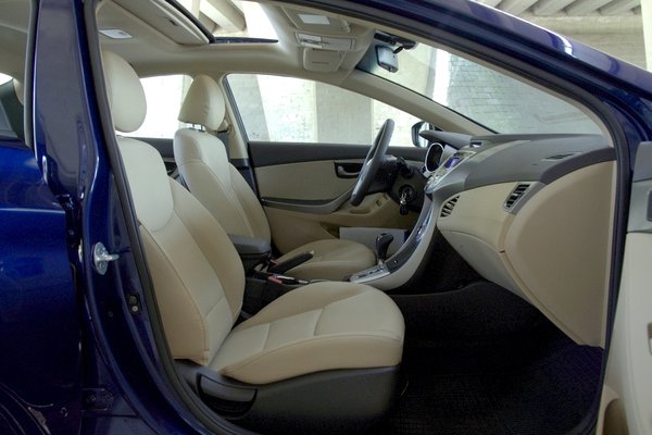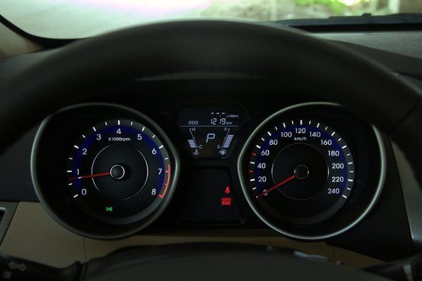 A műszerfal gusztusos, kellemes felszínű, de nem különösebben puha anyagokból épült. Egyébként teljesen más, mint az i30-é, da az már kifutó modell, nem lepődnék, meg, ha a következő i30 hasonló lenne belül. Szokás szerint kék az összes dolog háttérvilágítása – az i40-nél ebből visszavettek, az Elantránál sem ártott volna. Viszont a belső formák mozgalmasak, akad tárolóhely, az ülések jók, szóval meg lehet vele barátkozni.