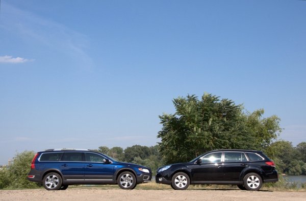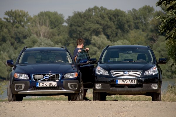 Hallatlanul érdekes két ilyen autót felváltva vezetni, nagyon kiadja az eltérő filozófiát. A Subaru exkluzív műszaki tartalmat, tökéletes acélremekeket árul, célközönsége Leonidász király és a spártai arisztokrácia. Semmi cicoma és modern extra, csak a bombabiztos összkerékhajtás és a Subaru Szent Grálja, a négyhengeres, 2,5-ös benzines boxer sima, pörgős járása. Fogyasztásban sincs nagy különbség: a Volvo D5-ösével 7,5-8 literrel járunk el városban, az Outback számítógépe 9,2 litert mutatott, ami elhanyagolható különbség. Mellesleg ez, amiben ültem, egy tízmilliós autó, a Volvo tesztautó pedig az extrákkal 17. A Subaru kicsit ideges, pattogós, bár Uj Péternek mostanában arról szólnak a horgásztörténetei, milyen szépen halad az Outback derékig érő sárban. „Egyhetes eső után mentem ki az ártérbe a derékig érő sárban, és ott ment el szépen, de nem száz métert, hanem kilométereket.” Nekem viszont megváltás volt visszaülni az XC70-be.