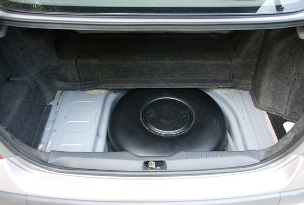 A tartály befért a pótkerék mélyedésébe, nagyjából 30 litert lehet beletölteni a benzinbetöltő nyílás mellett elhelyezett csonkon keresztül. Igaz, hogy bele kell tekerni egy adaptert, a lökhárító aljára szerelt töltőszelepekhez képest mégis elegánsabb, hogy a tankoláshoz nem kell térdre ereszkedni az autó mellett.