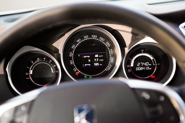 Szép a műszerfal, érdekes a fordulatszám megjelenítése képernyőn analóg módon. Ahogy az Insignia fordulatszámmérője színt vált, ha megérkeztünk a magasabb tartományba, a DS4-én is piros lesz a keret, de ez még villog is, mint egyszeri raliautóban a váltáslámpa. Kár is, hogy a DS3 Racingből ez kimaradt, mert jó dolog. Kedves figyelmesség a középkonzolon a központi zár gombja mellett a night panel-funkcióé; nem tudom, hogy hívják ezt a Citroennél, de kikapcsolja a képernyőt és a műszerek megvilágítását, csak a sebességmérő marad látható. Én mondjuk hagytam volna egy kis fényt a fordulatszámmérőn, mert Magyarország nagy részén már úgyis csak éjszaka lehet tempósabban menni.
