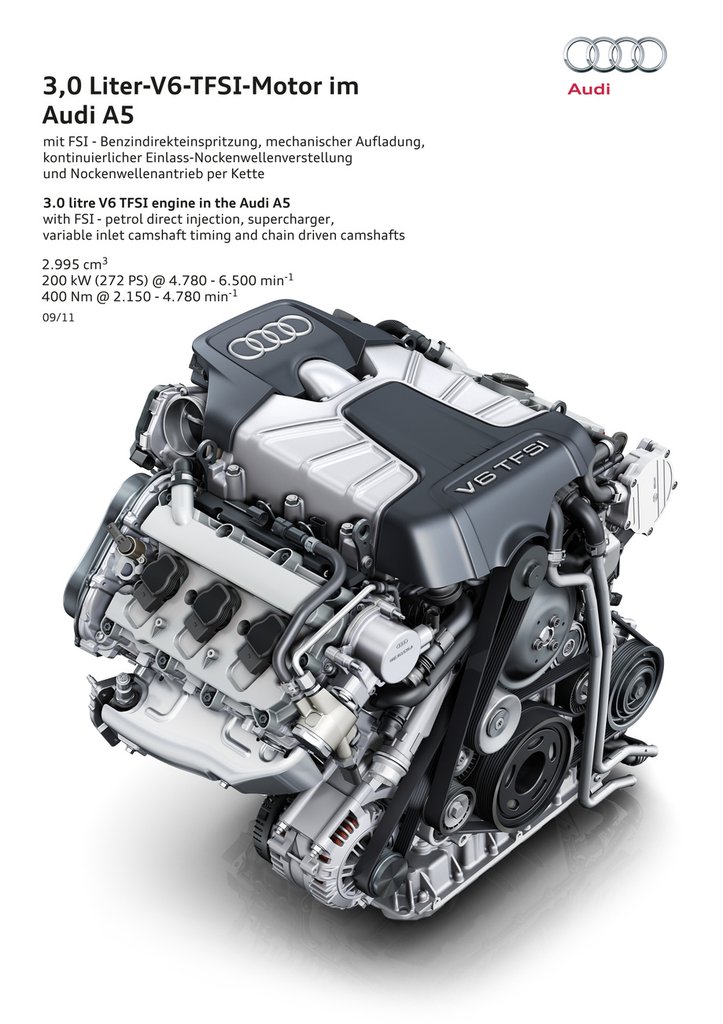 Vényolc-fétisiszták síró asszonykórusa búcsúztatta a 350 lóerős 4.2-es szívómotort, amely végleg eltűnt az A5-palettáról, csakúgy, mint az egy ideje már nyugdíjazott 3.2 V6. Mint a másik két német prémium-márkánál, a downsizing itt is felülről csócsálja a motorpalettát és ugyanúgy - mint a BMW vagy Mercedes esetében – itt is azok rinyálnak leghangosabban, akik jó eséllyel soha nem vesznek ilyen autót. Azt már persze kevesebben gondolják végig, hogy az általuk kicsinek titulált motor még így is háromezer köbcentis, hathengeres és hipermodern, akkora Roots-rendszerű kompresszorral a hengersorok között, mint egy Hajdú bojler. Így tud jelenleg az EURO5 által megszabott határértékek alatt maradni és jó eséllyel tudni fogja a 2014-ben életbe lépő EURO6-ot is. A motor 272 lóerős változata az A5 csúcsa, a 340 lóerős pedig az S5-é.