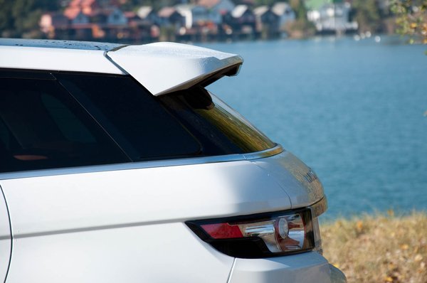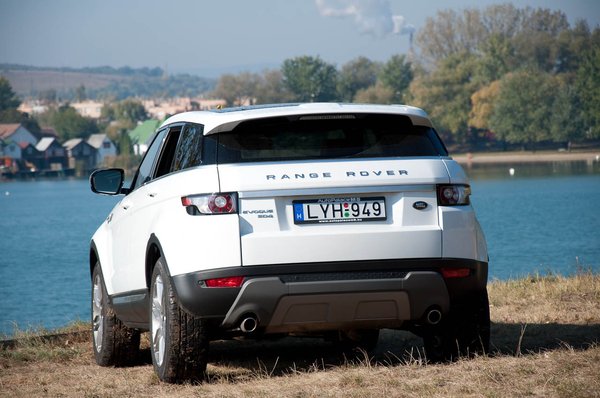 Az oldalnézet elég dögös. Nem látszik, hogy ez valójában lényegesen rövidebb, mint a hatályos Focus, ennek dacára sem hat aránytalannak, pedig átlátunk belőle egy átlagos szedán fölött. A tető vonala a Range Rover Sportéhoz hasonlóan egyenes vonalban lejt hátrafelé, a hátsó ülésen mégsem elégtelen a fejtér. Szemből talán még jobb. Hiába olyanok a szűkre húzott lámpák, mintha a Honda tervezte volna őket az FCX-hez, a hűtőrács és az ismert, szép tipográfiájú RANGE ROVER felirat épp elég britté és böszmévé teszi az orrot. Szeretnék rájönni, melyik nézete a legjobb, vagy legalább arra, melyik sikerült a legkevésbé, de sajnos hátulról is ugyanolyan állat. Az Evoque az utóbbi évek egyik legjobb formája.