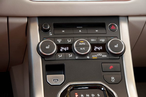 Szép a Range Rover-stílusban szögletes közepű kormány, bár kicsit sok rajta a gomb, a fő attrakció persze úgyis a korong-váltó. Bizony: évek óta gondolkozunk, minek az automatákba váltókar, amikor már a régi városi Ikarus buszokban is megfelelt egy PRIIIAN-gombsor. A padlóra rakott váltókar feleslegesen foglalja a helyet, a 7 BMW-Rolls-Royce Phantom stílusban kormányoszlopra helyezett kar feleslegesen növeli a valószínűleg amúgy is súlyos bajuszkapcsoló-káoszt. Az Evoque sem olyan radikális, hogy gombozna, de már majdnem ott tart: ha ráadtuk a gyújtást, a kardánalagútból kiemelkedik egy korong. Akkora, mint a BMW iDrive-ja, ezt tekerjük D-be, ha elindulnánk.