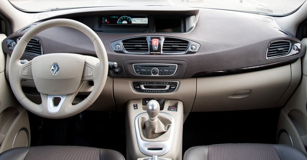 De aki megveszi, amúgy sem kívülről látja többször. A beltér egészen gusztusos ezzel a bézs-barna színösszeállítással. A műszerfal a drágább Renault modellekből ismert puha, gumiszerű műanyag, ami kifog a legszorgalmasabban kopogtató újságírókon is. Nagyon tetszett az ötlet, ahogy a fő műszeregység kikandikál a felhajtott szőnyegsarok-forma alól. A két fő színt megfűszerezték egy kevés zongoralakkal és mattezüsttel. Szerencsére itt megálltak, mert többféle műanyagot már nem bírt volna el.