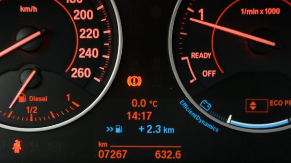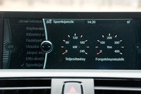 Az Eco Pro oszlopgrafikon minden üzemmódban elérhető, ahogy a sportműszerek is. Ezek az aktuális forgatónyomatékot és lóerő-felhasználást jelzik. Érdekes, de 130-as tempóhoz elég 50 lóerő a 184-ből. Jó pontot kap a BMW azért is, mert a központi kijelző kikapcsolt állapotban teljesen áramtalanított, így nem éget éjjel fekete pixeleket az arcunkba. Viszont a minden gyártó által beépített kötelező kilométeróra-csalást könnyű leleplezni: a tempomat ugyanis a GPS által is mért valós sebességet mutatja a számlapon (130-nál 127-et), míg a mutató fixen áll a valótlan értéken.