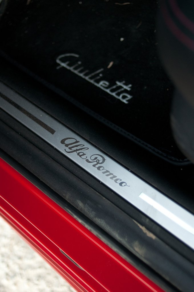 A Giulietta felirat a piac egyik legszebb tipója, igaz, ehhez nem is passzolt volna semmilyen modern betűtípus. Nem csak a hátsó ajtón jelenik meg, de visszaköszön a padlószőnyegen is, míg az Alfa Romeo felirat mellette, a küszöbön olvasható. A kulcsot is érdemes jól megnézni: a kötelező arculati elemek azon is ott vannak.