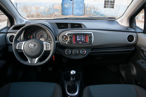 Ugyanez belülről már sokkal jobb világ. Sőt, a mai mezőnyben szinte kívánatos. Egyrészt a Yarisban viszonylag magasra feljön a fém, elég védettségérzetet ad, de azért marad elég üvegfelület ahhoz, hogy mégse érezzük magunkat bunkerben. Végre elfelejtették a középre hajított digitális műszeregységet is, van rendes műszer az ember orra előtt, továbbá normális, tornyosuló műszerfal. Olyan, mintha autóban ülnénk.
