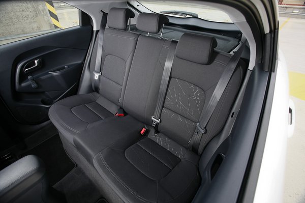 Az üléshelyzet az, amit igazán utáltam mindkét japán autónál: még koppra leeresztett ülések mellett is iszonyat magasan ülünk a kirakatban, ennélfogva a kormány még a legfelsőbb állásában is az ölünkben – ez a Yarisnál rosszabb, mint a Jazznél – forog. A Citroën ülését egyértelműn negyvenkilós, gyöngyhagyma seggű modelleknek találták ki, nagyon rövid az ülőlapja, emberi módon ülni csak a Kiában lehet. A világos betét sokat dob az amúgy fád beltéren, kicsit vidámabb, mint a Hondáé, de az összeszerelés minősége lehetne jobb, itt-ott akad egy kis félreillesztés és egymásra csúszott él.