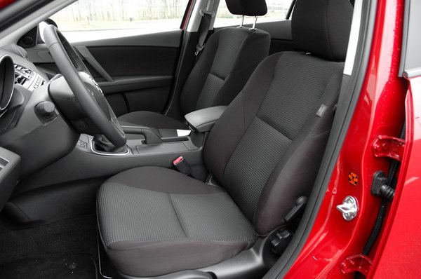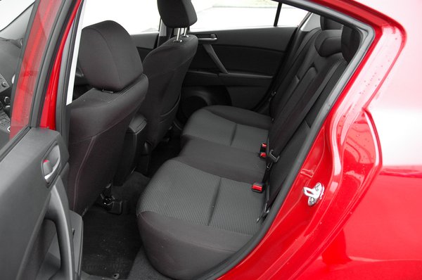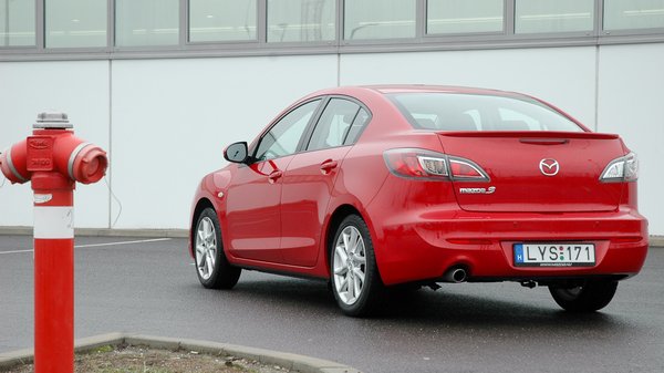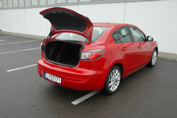 Ha valaki abban bízna, hogy cserébe a 3-as szedán kiemelkedően tágas, annak is csalódnia kell. Elöl persze el lehet férni, de ha saját 182 centis magasságomra állítottam az első ülést, hátul már érintette a térdem a támlát. Ha valaki abban reménykedne, hogy ezek után legalább a csomagtér átlagon felül tágas, annak is csalódnia kell: VDA szabvány szerint 430 literes, ami a fél számmal kisebb és fele ilyen drága Dacia Logan 500 literét ismerve nem tűnik kiváló eredménynek. A hátsó ülések ugyan lehajthatók, és egész használható méretű nyílás rejtőzik mögöttük, de a szedán még így is jóval korlátozottabb szállítási lehetőségeket nyújt, mint bármilyen ötajtós.