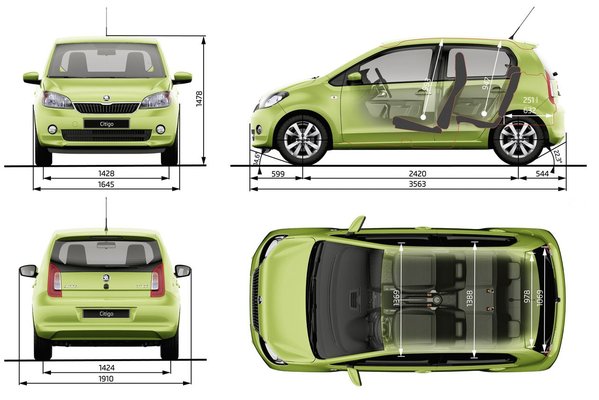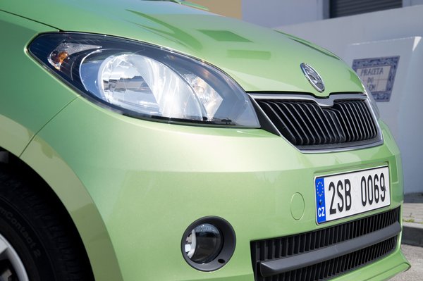 Mert a Citigo jól is néz ki. A zöld színt bő tizenöt éve először nélkülöző új Skoda-logó már nem a maszkban, hanem felette lakik. Maga a hűtőrács talán az elegáns, krómozott szélű Mladá Boleslav-i elem legjobb inkarnációja, ügyesek a kissé csodálkozó tekintetű fényszórók, a kerekek épp jó helyen csücsülnek a kerékjáratokban, a hátsó lámpa és a lapos farrész pedig egyenesen zseniális. Az embernek szinte fel se tűnik, hogy maga a doboz szinte ugyanaz, mint a mostani Renault Twingóé, csak kicsit nyúlánkabb. Hiába, a maximális helykihasználás, az olcsó gyártás és a kis méret erősen behatárolja egy ilyen bódén a domborzati viszonyokat.