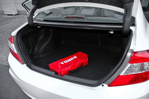 A Civic egyébként meglepően jól összerakott autó benyomását kelti, ami ilyen kemény műanyagok, és viszonylag sok illesztés mellett igazán meglepő. Egyetlen furcsaságot fedeztem fel: az elektromos ablak lehúzásakor határozottan megváltozott az ajtókárpitozás alakja, ami arról árulkodik, hogy az alkatrész nem kellően merev. Az autó igazi gyenge pontja azonban a csomagtér: nem valami tágas, a 440 liter még egy kategóriával lejjebb is átlag alattinak számít. Ráadásul a csomagtérfedél rövid, így hosszú, lapos odúba pakolunk, ami kényelmesnek egyáltalán nem nevezhető. Az üléstámlák ugyan osztva dönthetők, de a mögöttük levő nyílás szűk, így aki biciklit, teljes méretű babakocsit, vagy más nagyobb tárgyat szállítana a Civicben, meg fog szenvedni a feladattal.