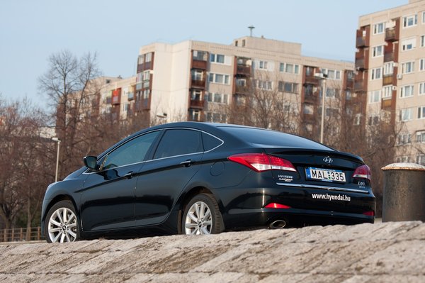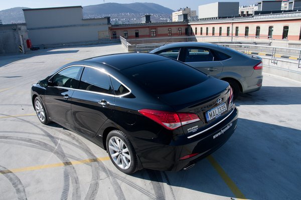 Az i40 szedán esetében végképp ott az a dézsávü-érzés, mégis meglepődtem, amikor a két autót egymás mellé állítottuk a fotózáshoz. A két sziluett, de még az oldalüvegek kontúrja is nagyon hasonlít – ha a két kocsi lámpáit elöl-hátul letakarnánk, nehéz lenne megmondani, melyik melyik. (Annak ellenére egyébként, hogy a Mondeónk egy ötajtós volt: a Fordnál a szedán kontúrja teljesen ugyanilyen.) Az i40 kombinál még csak-csak felfedez egy-egy vonást más típusokról az ember, de a szedán üzenete egyértelmű: én vagyok az alternatív Mondeo.
