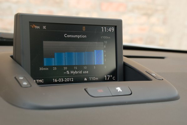 A billenőkapcsoló-sor ugyan Mini-nyúlás, szerencsére olyan finoman pattannak a gombjai, mint ott, minden, ami nyomható-pöckölhető vagy billenthető, olyan puhán teszi ezt, mint ahogy a kanál fordul a forró pudingban. Megkaptuk a PSA-féle HUD-kivetítőt, a jókora, billenthető-eltüntethető (ilyet sok drágább típus nem tud) képernyőn pedig a hibridhajtás aktuális folyamatábráját is nyomon követhetjük. Vagy bármi mást, a navigációs rendszer pl. kifejezetten felhasználóbarát, abszolút friss volt a szoftver és gyorsan számolt-újratervezett, ha kellett.