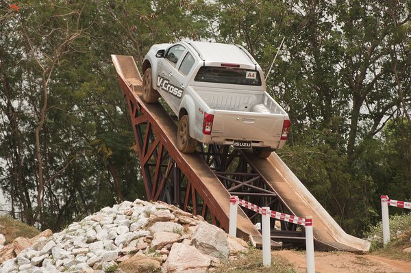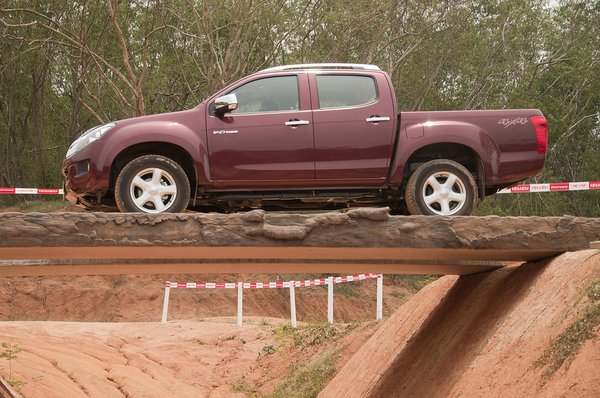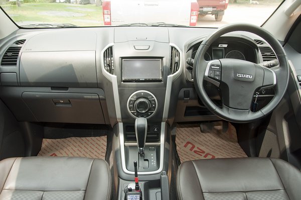 A D-Max automatával és hatfokozatú kéziváltóval is elérhető, én ez utóbbit próbáltam. Gyors gangolásról nem mesélnék, mivel Thaiföldön jobboldali a kormány (és királyuk is van, Bhumibol Aduljadezst), így bal kézzel kevésbé rutinosan kevergettem az egyébként szépen, rövid úton járó kart. A hajtást elektromos forgótárcsával vezéreljük. 4x2-ből 4x4-be menet közben százig át lehet tenni, a felezőhöz álló helyzet, üresbe kapcsolt váltó kell. Az autentikus terepesek persze ilyenkor csóválják a fejüket, nem bíznak az ilyen villanyos izékben – részben igazuk is van, viszont ez pickup és nem egy véresen komoly off-roader. Többek között már önzáró differenciálja sincs, ezt is elektromosan próbálják pótolni a TCS (Traction Control System) elnevezésű kütyüvel.