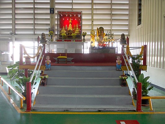 A gyártósornál volt szerencsénk turnézni. Azt hiszem, szervezésben a japánokat csak azok a thaiföldiek képesek megelőzni, akik a japán főnökeiknek akarnak megfelelni: egyenpólót húzattak az európai sajtóbrigáddal, letiltották a fotózást, majd sebesen áthúztak minket a végső összeszerelést (2012 végére évi 400 ezer darab) végző csarnokon. A felsőbb hatalomban bizakodó autósoknak talán jó hír: méretes buddhista oltár is van a szalag végén.