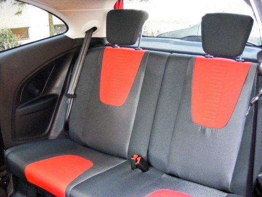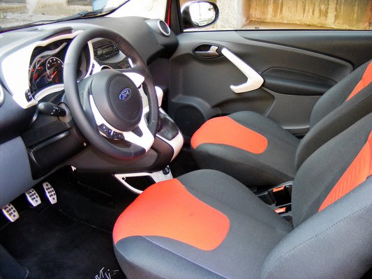 Ha már Prágánál járunk, kitérnék a hátsó utastérre: a Ka a legtöbb női kisautóhoz hasonlóan háromajtós, és nem több mint négyszemélyes. Vagyis ne várjunk tőle csodákat. De talán az új Ka hátsó tere a réginél is kisebbre sikeredett. Hátsó utasaim sajnos nem csak a ki- és beszállásra panaszkodtak: nincs kapaszkodó az első ülések felett, amitől tényleg nagyon nehéz kikúszni hátulról. Volt panasz a kényelmetlen ülésekre, valamint a pici, lőrésszerű ablakok és az alacsonyabb tető okozta nyomasztó érzésre is. Hogy befértünk négyen háromnapi csomagokkal, csak a kis testméretünknek köszönhető (a dalia is csak 170 cm volt közülünk); azt pedig, hogy el is indultunk Prágába, minden bizonnyal pillanatnyi elmezavar okozhatta. Kalandos volt, még a szélcsatorna liftjébe is beragadtunk, bár ennek nincs köze az autóhoz; de inkább ne induljunk vele messzi kirándulásra. Rövid távon még elmegy, otthonról az iskoláig ki lehet bírni, van állítható fejtámla és könyöklő is, de félóránál hosszabb utat nem javaslok.