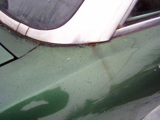 Hát akkor? Mutatja a folytatást. A további képeken a hátsó ablak alatt randán csipállik. A díszlécek alatt is gyanús vasoxid-nyomok, mindenfelé mállik a festék. Naja, hiszen eredetileg csibesárga volt az autó, a zöld már új fényezés. Volt, valamikor régen. Alul pedig... Ezt bizony sokszor áttaknyalták alvázvédővel, még szinte az olajfolyások forrásait is eldugaszolták a sok festékkel. Nem sikerült, az egész autó alja egy undorító, rozsdás-kátrányos-olajos, gyanús massza volt, nem nagyon más, mint az elhagyott írországi hajógyárakban ott felejtett vasdarabok.