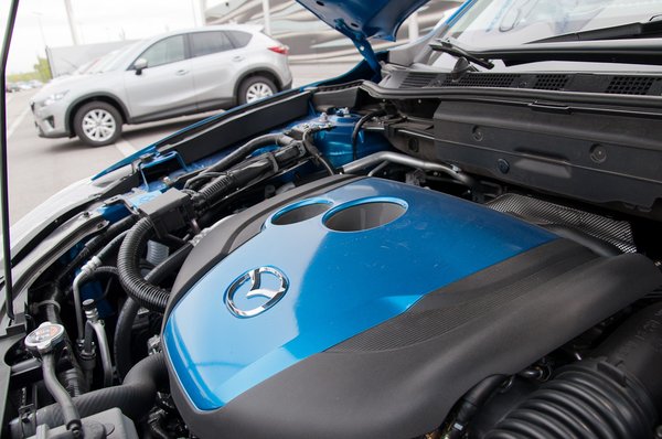 Ennek elkerülésére a közvetlen benzinbefecskendezéses, rétegelt keverékképzésű SkyActiv-G (benzines) motorban úgy játszanak a változó szelepvezérléssel, gyújtásszöggel, hogy ez a kopogás ne következzen be. A forró kipufogógázoktól pedig egy olyan, hangolt, 4:2:1-es leömlőrendszer segítségével szabadul meg a motor extra sebességgel, ami Formula-1-es versenymotoroknak is díszére válna. Csakhogy itt a kis ellennyomást biztosító, sokkígyós hurkatöltő nem hosszan, hátrafelé terül el, hanem azt be kellett passzírozni a motor és a hűtő között levő kis térbe, ráadásul a katalizátornak is szorítani kellett ott egy kis helyet. Egészen elképesztő, ahogy kinéz – krómozott ételhordó doboz a fényes anakondák fojtogató ölelésében.