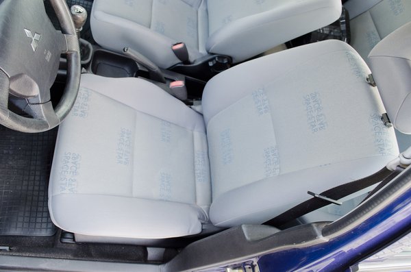 A beltér viszont érdekes. Nem a műszerfal, sokkal inkább az ülések: a kárpit a fapados légitársaságok, vagy talán inkább a chartergépek stílusában tartalmaz kék SPACE STAR feliratokat. De vajon minek kell történnie egy autóval ahhoz, hogy a fejtámla fémszárai rozsdásak legyenek? Csupa extrémül izzadó illető használta valamennyi ülést?