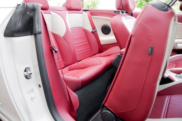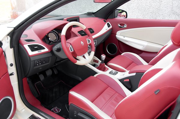 Az első, ami üt, az a beltér színkombinációja. Értem én a Renault igyekezetét, hogy a régi idők klasszikus, mélyvörös kabrió-(mű)bőrbelsejét idézné. De abból nem volt 36 négyzetméternyi, ahhoz krómkeretes körműszerek jártak műszerfal tetejére dobott sofőrkesztyűvel, krómpálcás váltókarral és a gondtalan élet boldogságával. És vörös volt, ez pedig nem az. Sem színben sem minőségben. Leginkább a bőrzúzalékból sütött olcsó kanapékra emlékeztető tapintása, gatyarohasztó szellőzetlensége és sérülékenysége (egy egyszerű farzseb-gomb is képes felsérteni) miatt is messze száműzném bármilyen járműből.