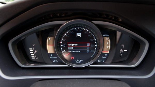 Egyébként a V40-esről könyvet lehetne írni, annyi mindent zsúfoltak bele. A belső hangulatvilágítás színe változtatható, a műszerfal pedig TFT-kijelzős, emiatt az óráknak nincsen benne fix helye. Háromféle stílus választható, van, amelyik általános óraegyüttest mutat, van, amelyik ECO-műszerrel, a fordulatszámmérő háttérbe szorításával a takarékosságot szolgálja, és létezik egy sportos, piros hátterű változat is, amelynél a nagy, központi kört a fordulatszámmérő tölti ki, ilyenkor a sebességmérő digitális, a többi kijelzés pedig csak mellékszerepet kap. Elméletileg lehetne hasonló témából vagy másik ötven – amit egy újságírótársamat idézve – „lehetne árusítani pénzért a neten, aztán csak fel kéne tölteni az autó számítógépére”. Tessék, egy lehetőség.