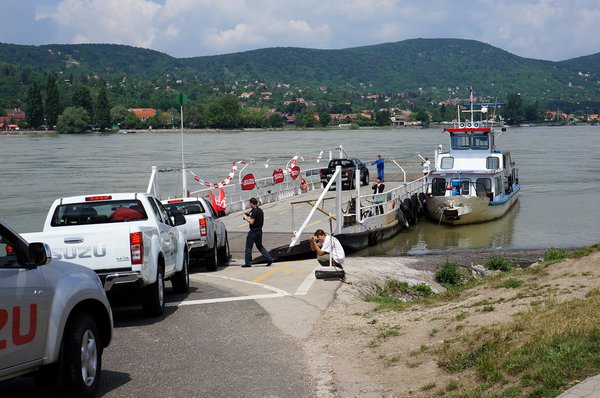 Az itiner felcsalt minket a visegrádi vár alá, ahol már jó néhány Isuzu felgyűlt. Ekkor megjelent egy turistabusz, és kiöntött magából vagy harminc embert, akik hirtelen nem is tudták, mit fotózzanak, a festői Dunakanyart vagy a nem kevésbé festői platós terepjárókat. Innen a társaság a komphoz ereszkedett le, ahol megint mi voltunk a helyi látványosság aznapra. Az egykor szebb napokat is látott SZŐD vontatta kompra végül felfért az egész társaság.