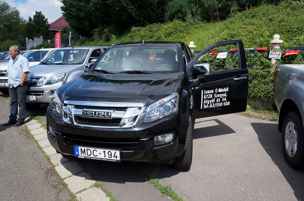 Párokra oszlottunk, így én a Camion magazinos Kiss Bercivel kezdtem vadászni a tesztautóra. Az áldozat végül egy automata váltós modell lett. A régi D-Maxhoz képest változás, hogy míg régen csak a 3 literes motorhoz lehetett automatát rendelni, most már kizárólag egyféle, 2,5 literes, 163 lóerős és 400 Nm-es motor van az árlistán, de az van automatával is. Ehhez a hatsebességes kézi vagy ötsebességes automata váltóközül választhatunk. Az automata amúgy sokat változott: a fix 2,3 helyett itt már van kézi kapcsolási lehetőség, illetve eggyel több fokozat könnyíti az életet az autópályán és országúton.