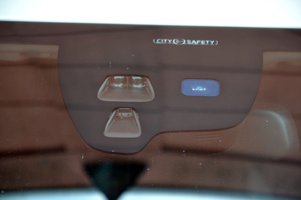 A 700 ezres City Safety-névre keresztelt ütközésmegelőző-fékező és monitorozó rendszer és az esőérzékelő óriási háza a középső visszapillantó-tükör alatt meredezik. Mondjuk hogy működik-e, nem tudom, mert soha nem jelzett, talán nem is kellett, de jobb is így: én személy szerint egyáltalán nem bízom abban a féktávban, amit nem az én lábam ad meg. Na meg aztán: volt ezzel gondja a Volvónak bár igaz, azóta megnyertek vele egy ADAC-tesztet, szóval csak betonbiztosan működik már...
