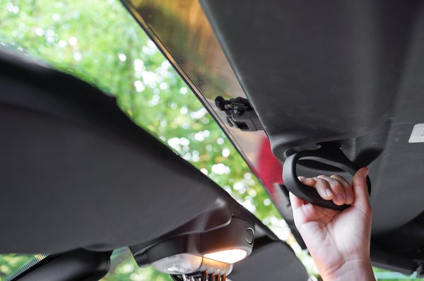 Él bennem a kétely, hogy a nálam rövidebb karúak, illetve a nők nehezen érik majd el az ülésről a nyitott tetőt, amely teljesen eltűnik a fejtámlák fölötti, íves és fényes bukókeretek mögött. A másodperceket nem számoltam, és menet közben sem rángattam az alulnézetből döbbenetesen egyszerű kivitelű szerkezetet.