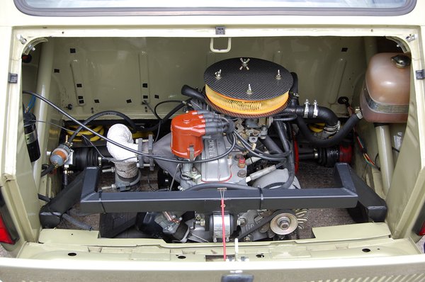 A beépítése nem egyszerű, hiszen ez egy vízhűtéses blokk, a hűtő elöl van, valamint társul hozzá egy fűtőradiátor is, így az autónak rendes fűtése is van. A víz a középső alagútban megy előre és jön vissza tefloncsövekben, amelyeket gumi illesztékkel, bilincsekkel csatlakoztatott a radiátorokhoz. A hűtő előtt a köténylemez ki van vágva és az első lökhárító is kicsit módosított, az értő szemek észreveszik, a szomszéd néni soha. A próbaúton Gábor rúgta az autónak, néztem a vízhőfokot, nem melegedett a blokk. Ráadásul tudtam azt is, hogy ha a Bogaramat én így lőném, akkor a léghűtéses azért kikönnyezne egy kis olajat, de a Fiat motor porszáraz és tiszta maradt.