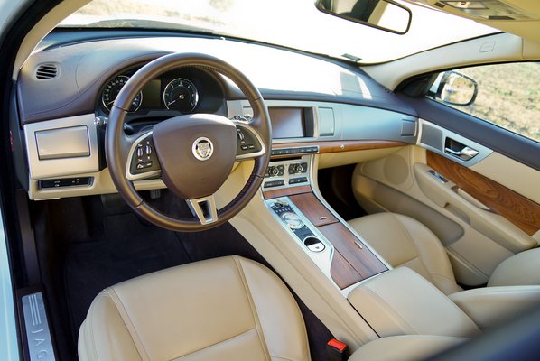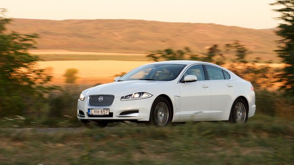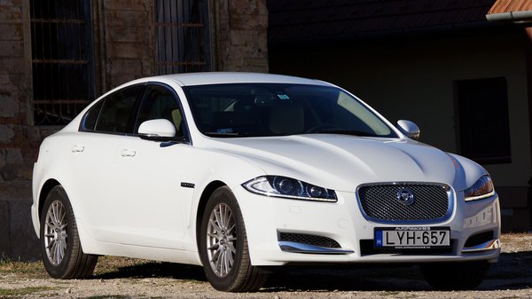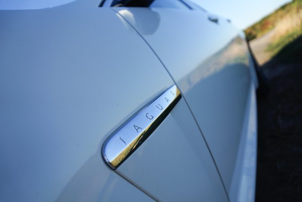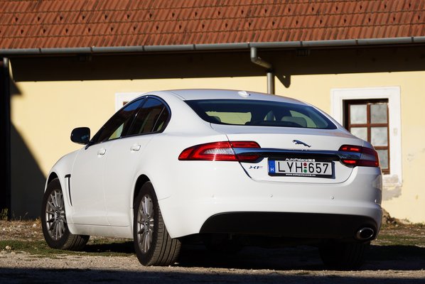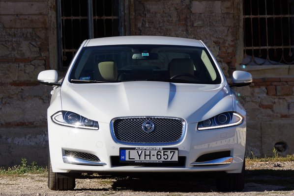 Kívülről gyönyörű, benne van a tipikus Jaguar nézet, a C-oszlop és környéke hátulról, a lámpákkal. Egyszerű, nem hivalkodó, nincs teleízléstelenkedve krómdísszel az oldala, mindössze az ablakkeretek, és az első sárvédőkön a két Jaguar felirat krómos. A többi fehér. Ez a teljesen ideális menyasszonyi autó. Az eleje már nem ilyen egyértelmű, mert megjelent egy ledsor az eddigi felhúzott szemöldök helyett, nekem az előző kinézet jobban tetszett, a felhúzott géptetővel, de led nélkül. Ugró macska rég nincs, viszont a géptetőpúp - ami elég régóta van a Jaguarokon - na, az megvan rendesen. Az outfit eléggé különleges, mindenki megnézi még ott is, ahol az A6, az 5-ös és az E-klasse a közértbejárós.