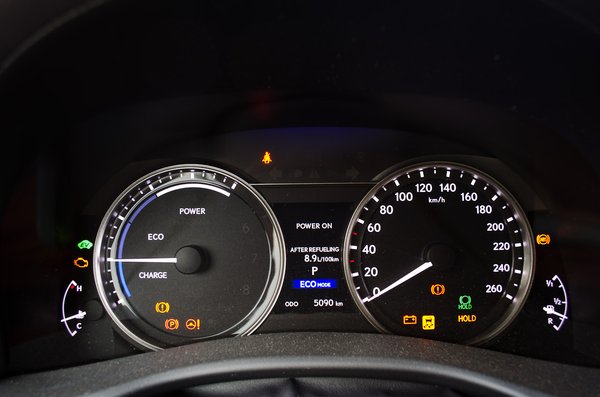 A GS 450 h nem rettenetesen erős. Inkább azt mondanám, eléggé. 200-ig például ha nem is vehemensen, de szépen gyorsul. Az Atkinson-ciklusú V6-os benzines nem arról szól, mint egy régebbi Alfa hasonló motorja, tehát legalább annyival hervasztóbb a hangja, amennyivel gazdaságosabb: sokkal. A 3,5-ös sziívó- és kipufogóoldalon is változó szelepvezérlésű blokk önmagában 292 lóerős, ehhez, és a 352 Nm nyomatékhoz adódik a 200 LE-s villanymotor, meg az ő 275 Nm-es nyomatéka. Ketten együtt adják ki az 5,9 másodperces százas sprintet, amin nincs mit ragozni: brutális. 100-as tempó felett egyébként súlyosbodik a hervasztás: folyamatosan vinnyog hatezres fordulaton, miközben a Lexusnál fokozottan hívják fel a figyelmünket, hogy ez nem fokozatmentes CVT váltó, hanem bolygómű, de a hervasztás amúgy is a vinnyogás karakteréből fakad – nem valami harcias. 100 alatt valamiért kellemesebb, de az sem valami sportos hang.