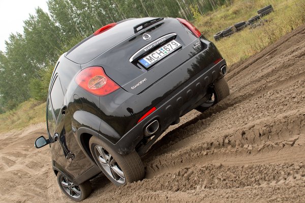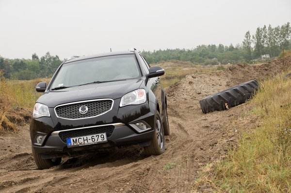 De aki terepjáró-specialistának mondja magát, annak a sárban is mutatnia kell valamit. Ki is mentünk a ssangyongosokkal a gyáli motokrossz-pályára, ahol kellemesen felázott talajon dagonyáztunk egy kört az automata váltós, összkerekes, fullos tavalyi modellel. Eleinte feszengtem, mi lesz, ha leütöm a lökhárítót a mutatós fekete Korandóról, de az első kóstolgatás után SUV-hoz képest valóban használhatónak tűntek a terepszögek. A tizennyolc centi hasmagasság is a magasabb értékek közé tartozik a kategóriában, így második nekifutásra mégis megpróbáltam elásni a kis gombócot.
