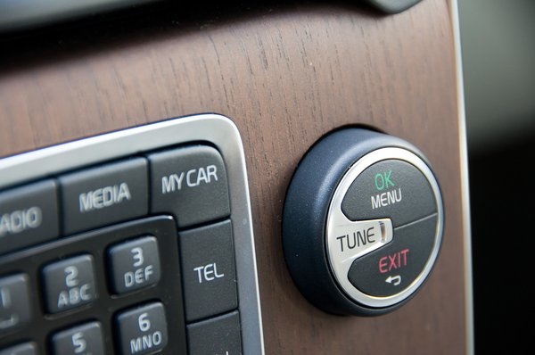 Szóval ez a fa nagyon rendben van. A négy tekerőgomb rajta szintén. A telefonbillentyűzet középen engem ugyan irritál, de ez már a Volvo-dizájn része, a többi kis gomb a kellemesen konzervatív feliratokkal pedig mind egyszerűen, logikusan kezelhető. A selyemfényűre polírozott fémből vagy fémszerű valamiből - ezt sosem lehet pontosan tudni - éppen annyit hintettek el, amennyi még nem mondható ízléstelennek; a statikus látvány nálam kilenc és fél pontos.