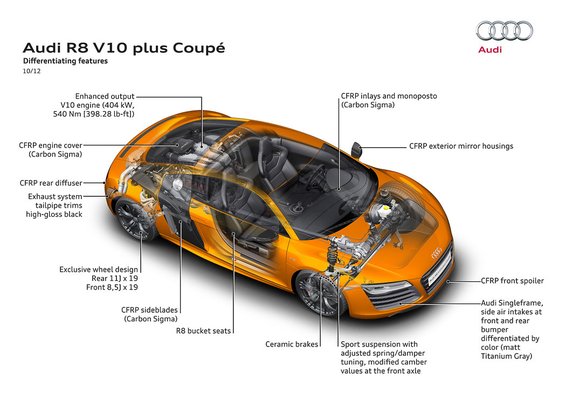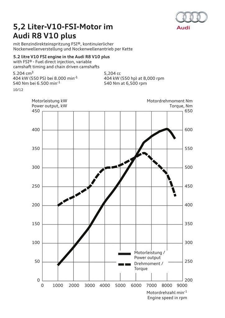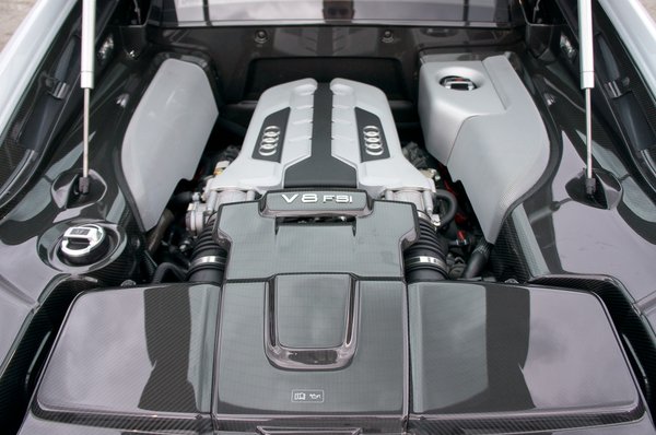 Mindkét motor erősebb lett, a V8 már 430 lóerőt és ugyanennyi newtonmétert tud, a Lamborghinivel közösen használt V10 alapból 525 lóerős 530 Nm csúcsnyomatékkal, a V10 plus tízhengerese pedig 25 lóerővel és 10 newtonméterrel többet. Mindkét motor szárazkarteres kenésű, a motor mögötti puffertartály nagykapacitású olajszivattyúja a terhelésnek megfelelő mennyiségű olajat jutattatja a motorba. Elterjedt tévhit, hogy a V10-es motor valójában Lamborghini-fejlesztés az Audi pedig csak élősködik rajta, de ez nem így van. A motort a németek tervezték.