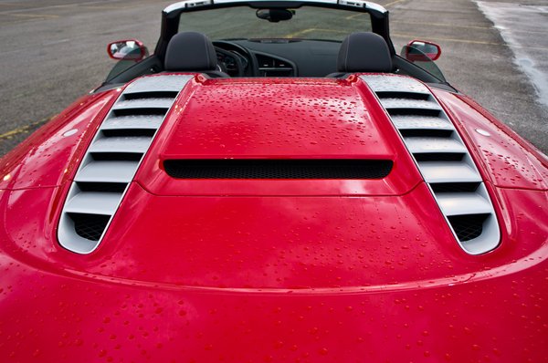 Hogy a nyitott Spyder formája mennyire ütős lett, azt mi sem bizonyítja jobban, mint a tény, hogy én – aki alapvetően simán ratyinak tart minden nyitott középmotoros autót – is megbuzultam egy pillanat alatt. A géptetőn végigfutó két púp nem újkeletű találmány, a Ferrarinál is ugyanúgy megvan, de maga a forma és a légrostélyok szürke alumíniumja tökéletesen példázza a német és az olasz formatervező-iskola közötti különbséget.