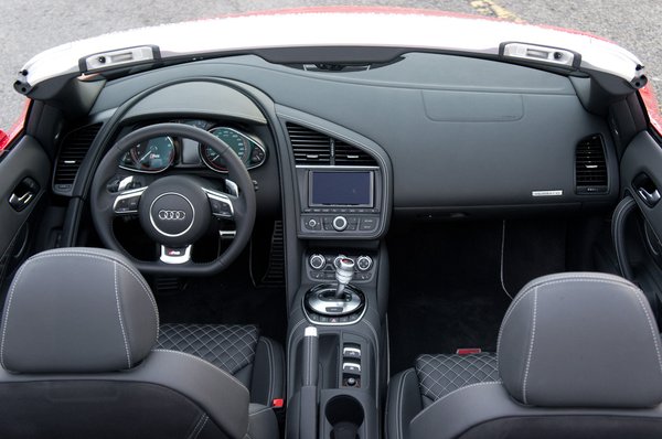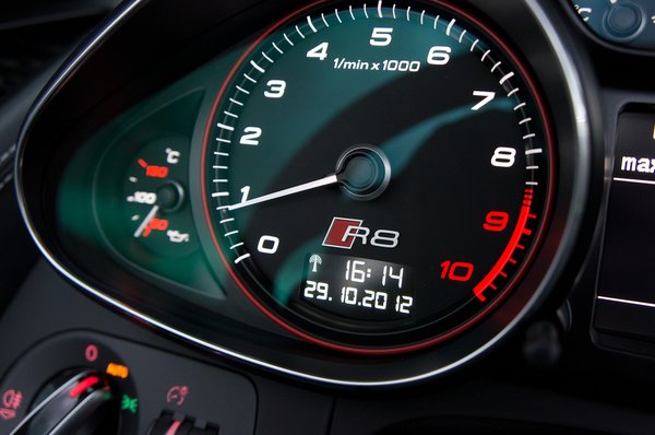 Igen, valóban nem kapható hozzá három, különféle méretű ülés, mint a 458-ashoz, csak egyféle, azt kell beállítania mindenkinek. Valóban nincs Manettino a kormányán, folyadékkristályos állapotkijelző a fordulatszámmérőben, vagy index a kormánykeréken, sőt, - micsoda primitívség – az R8 V10 plus futóműve még csak nem is állítható, hiszen Magnetic Ride csak a V8-ashoz és a V10-eshez jár (előbbinél felárért), így be kell érnünk azzal a futóművel, amit a Quattro GmbH mérnökei jónak láttak.