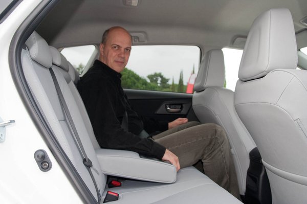 Hátul is van hely, éppen. Se nem szűk, se nem tág, egy 187 centis csávó mögött egy másik 187 centis csávó épp jól elfér (más mérőeszköz nem volt nálam) – a feje még messze a plafontól, a térde már súrolja az első támlát. Itt egyébként két centi a javulás. Kicsit nagyobb a csomagtartó is, van az ismert, két szinten rögzíthető padlója, amire extra szükség van itt, hiszen a hibrid változatnál az akku miatt nem lehet felhajtani a hátsó ülőlapot, s így lehetett megvalósítani ledöntött hátsó ülésekkel a sík raktérpadlót.