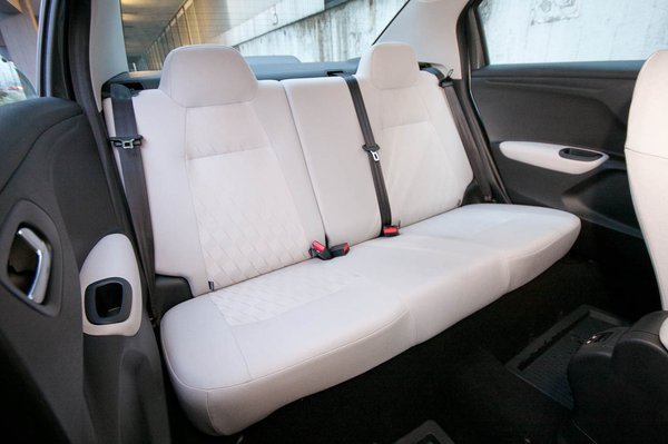 Nem mondom, az első ülések lehetnének szélesebbek, itt látszik, hogy ez kisautó-technika, nincs több hely széltében. Még az ajtóra is jutott egy kis puha felület, ahol könyökölhetünk, kedves gondoskodás. Hátul gigászi a tér, egy normál felnőtt elfér gond nélkül, már ami a térdét illeti. Még a 4,5 éves lányom sem tudta összerugdosni a háttámlát a gyerekülésből, mert nem érte el. Viszont a nagy testmagasságnak gátat szab a tető.