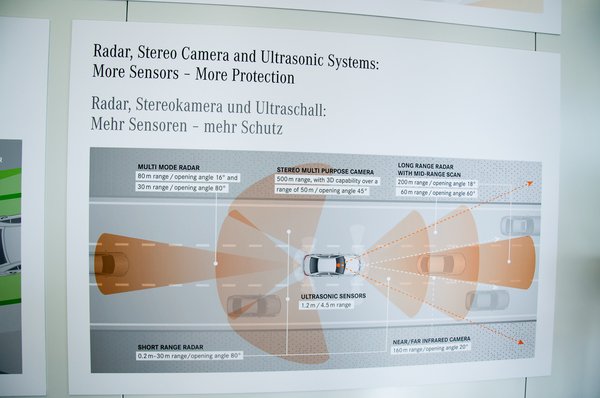 Annyi radarral és kamerával lehet már körberakni az E-t, hogy tulajdonképpen már csak előzékenységből hagy minket vezetni. Rövid és hosszú hatótávon pásztáznak elöl a radarok, a tükör fölött egy új, sztereó kamera nézi az utat, így majd' fél kilométerig ellát az autó, de a közeli forgalmat 3D-ben tudja értelmezni. És ezt egyre látványosabban használja arra, hogy kivegye a kezünkből a kormányt. Pardon, hogy vész esetén segítsen.