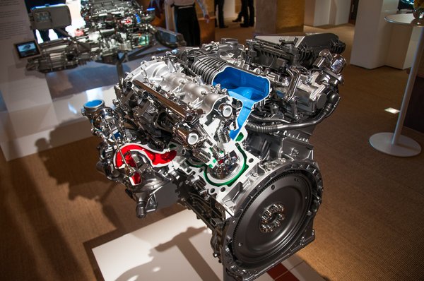Ebből a motorból is kiokosítattam magam a metszet mellé állított mérnökkel. Arra volt a legbüszkébb, hogy a kipufogószelepek és a turbófeltöltő között milyen rövid az út - szerinte nincs ma olyan motor, amelynél közelebb lenne a turbó az égéstérhez, ami azért fontos, hogy minél jobb legyen a gázreakció, minél kisebb a turbólyuk. Tanúsíthatom, tényleg alig érezhető, talán egy-két tizedmásodperc lehet, amíg megjön a teljes kraft, de mivel ezt a motort már kizárólag a Mercedes saját hétgangos, olajkavarós automatájával árulják, elmarad a hátbavágás, csak azt érezzük, hogy alacsonyabb fokozatokban padlógázon kicsit nehezebb lélegezni, ahogy összeszorul a tüdő.