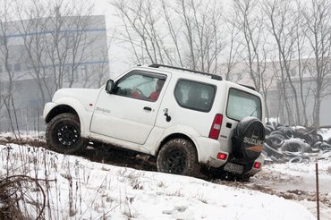 A Jimny nem SUV, de mint a ma létező legolcsóbb terepjárónak itt a helye, etalonnak. Alapból hátsókerekes, a vezető kapcsolja az összkerékhajtást, semmi automatika, ESP-ről és más elektronikus segédletről ne is álmodjunk. Bár a miniatűr benzinmotort gyötörni kell, mindig azt csinálja, amit a vezető akar, nem veszi el a gázt a kipörgésgátlás. A siratófalon az AT gumik hátrányba hozták, mert ezek igazán sem havon, sem sárban, sem aszfalton nem az igaziak: esetünkben teljesen eltömődött a mintázat, és alulmaradt a Daciával szemben. Viszont utána az off-road pályán kacagva kotort végig, tényleg zseniális, fickós kis gép ez. Mindenki mosolygott benne, könnyed, közvetlen, bár a motor ereje véges, de ne feldjük: vasággyal egy tonna.