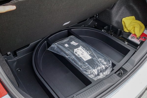 Csakhogy esetünkben egy ötletes tárolórendszer került a padlója alá, amit kihajítani sem lehet onnan, mert jól becsavarozták. Ahhoz alacsony, hogy bármi érdemleges cucc beleférjen, az EÜ-csomag is felpúposította a reszketeg csomagtérpadlót. Azóta járt nálunk a hibrid, jelentem, annak tényleg megvan 360 literes a csomagtartója, ez viszont nem sokkal lehet több 300-nál. Kicsi, na. Viszont legalább vészpótkereket dugtak alá.
