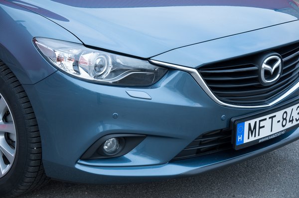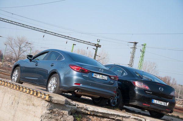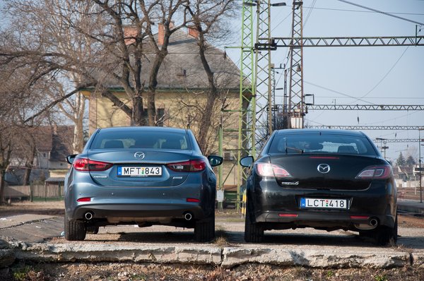 Melléállítjuk az elődjét, és a régi 6-os forma, ami egyébként még ma is mutatósnak számít, hirtelen rémesen vénnek tűnik. Az utóbbi évek Mazda-védjegye, a kikönyöklő első sárvédő mintha most ért volna be, így, hogy folytatódik az első ajtóban; a csücsörítősre nyitott hűtőmaszk határozottabb tekintetet ad neki, a fényszóró szúrósabban néz. Végre leszakadtak az átlátszó hátsó lámpákról is, az újé éppen annyira érdekes, hogy még bőven elmegy elegánsnak, de nem kell őrlődnünk, hogy ez már bazári-e vagy sem.