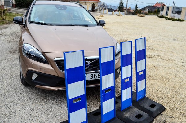 A V40 Cross Country City Safe rendszerét alaposan teszteltem. Természetesen nem másik autóval, vagy betonfallal próbáltam ki, hogy a dugóban elmélázó sofőrt kisegíti-e egy satufékkel az elektronika, inkább elkértem a volvósoktól a demonstrációs célokra használt négy darab talpas műanyagot, ami tömeghatásában sokkal szellősebb, mint egy autó. Tízszer próbáltam ki, hogy az ember a fék érintése nélkül, esetleg kifejezetten kis gázzal nekigurul az akadálynak, és tizenegyből tízszer tökéletesen megállt.