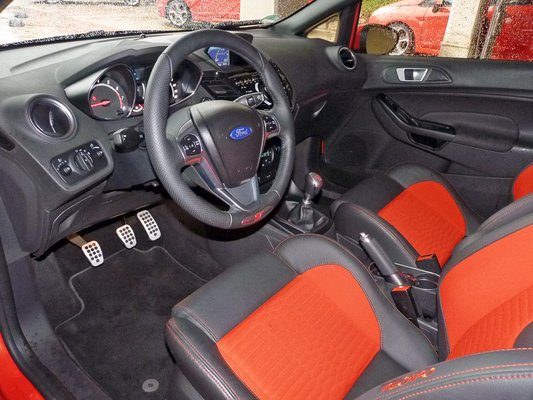 A belső teret a piros ledekkel átvilágított küszöbök határolják, természetesen ST felirattal. Az ergonómiával nincs gond, minden ott van, ahol kell, a kormány minden irányban állítható, az ülések tág határok között pozícionálhatók, rövid szöszmötöléssel tehát ki-ki beállíthatja a neki megfelelő testhelyzetet. Hátul a hely annyi, amennyi, én például rendesen bevertem a térdemet az első ülések közötti méretes boxba, amikor próbáltam kikászálódni szorult helyzetemből. Érdekesség, hogy a világautóként forgalmazott Fiesta ST-t az USA-ban kizárólag ötajtós kivitelben értékesítik (felzúdulás a sajtótájékoztatón). A praktikus amerikaiak ezek szerint többre tartják a kényelmet a sportos formánál. Menet közben az alacsony ablakok és a passzentos kabin miatt szinte úgy érzi az ember, hogy egy kis repülőgépet vezet, és ez jó érzés. Újabb elismerés jár a karosszéria merevségéért: rázós úton, fekvőrendőrön, sínen átkelve sem bírtunk egyetlen nyisszanást sem kicsikarni, a futóművek is csendesek, remélem, ez a használat során sem változik majd.