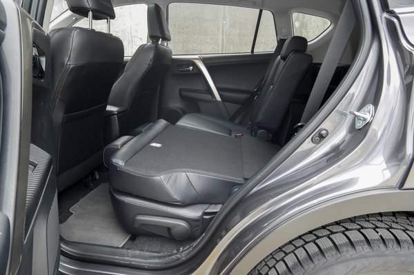 Amúgy a RAV4 teljesen rendben van: jó formájúak az ülései, hátul hatalmas a tér,és az külön jó, hogy a kardánalagutat felszámolták, a padló szinte teljesen sík. Nem tudom, hogyan csinálták, mert kardán az van. A hátsó üléstámla dőlésszöge hatalmas mértékben állítható, a csomagtartó mérete még pótkerékkel együtt is megüti a fél köbmétert, a mi vészkerekes tesztautónké pedig 547 l volt. A hátsó ülések egy mozdulattal lapulnak síkba, egy egyszerű, kempingszék-szerű mechanizmussal; ha Mazda lenne, azt mondanám, Karakuri. A RAV4 tényleg olyan, mint amilyennek egy családi autónak lennie kell, ne zavarjon meg senkit a terepjárós jelleg.