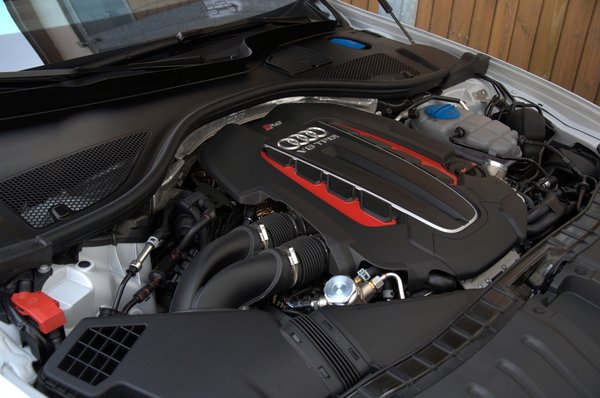 A motorháztető alatt az S6-ból már jól ismert, hengerlekapcsolós biturbó V8 átdolgozott változata terjeng, működés közben olyan hőleadással, hogy fotózni is csak messziről mertük, mert perzselte a karunkon a szőrt.