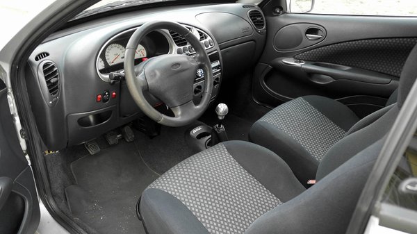 A kárpit anyaga nem az a kétezres évekbeli műanyagkoton-szövet, hanem még a kellemes. Az ülés puha, de rendes oldaltartása van, nekem kicsit szűk is, de hamar megszoktam. A kormány nagyon jó: kicsi és jó fogású. A váltókar vékony pálcika, tetején fémmel, a műszerfal tojásdad, ami régebben nem tetszett, de nem olyan béna, mint a Focusé. Az utas előtt a műszerfal visszahúzódik, kicsi fura ott az üres tér, de mivel így a hangsúlyosabb a vezetőoldal, jól néz ki, eléggé sportautós.